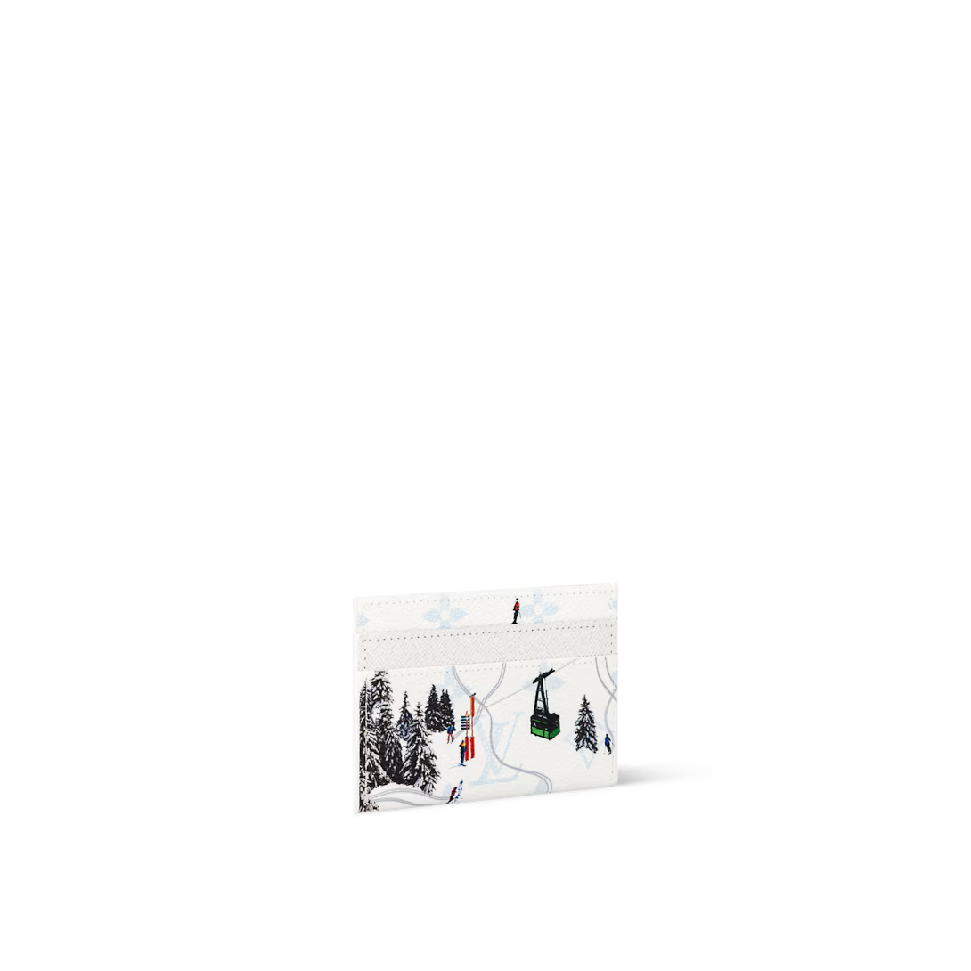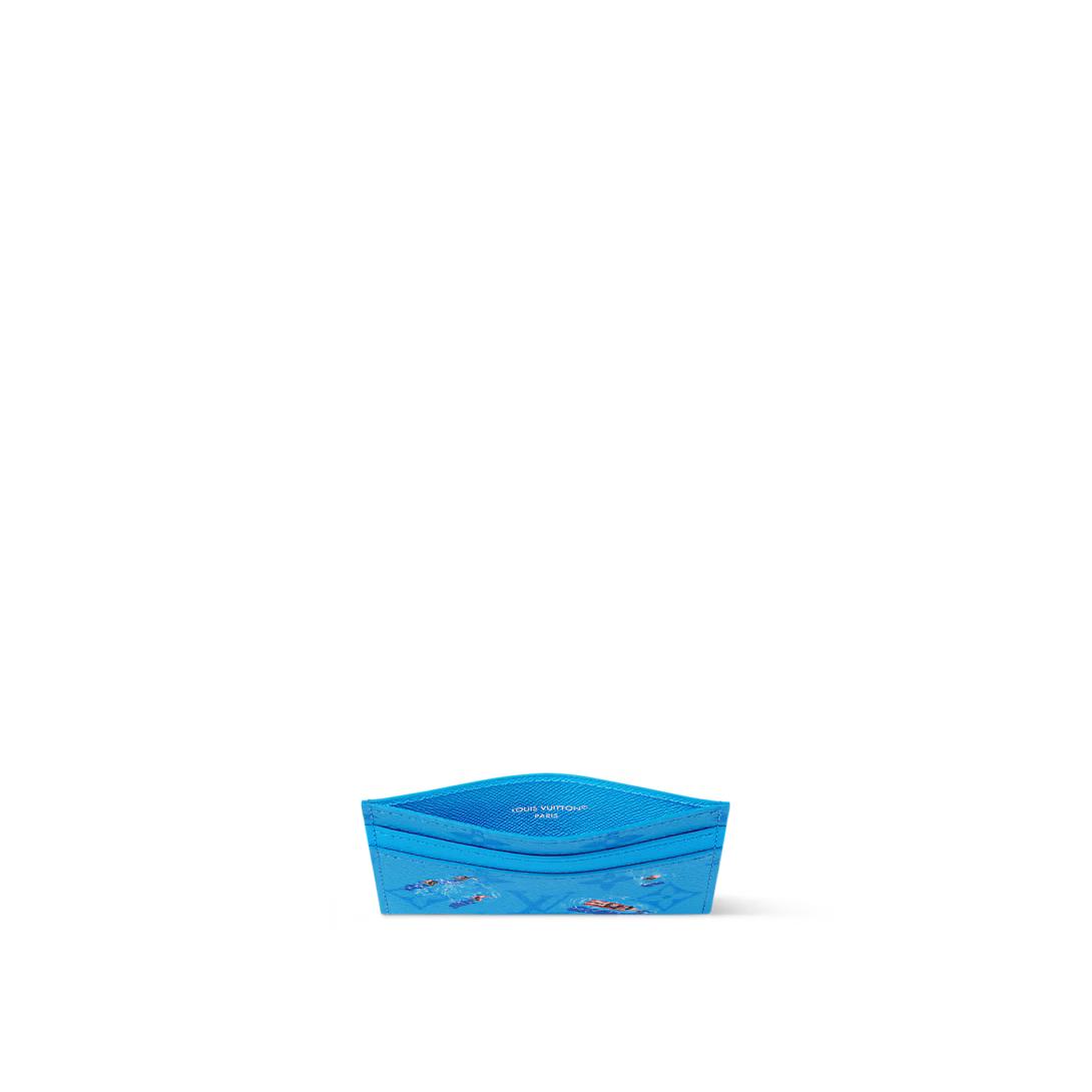 Part of the Father's Day collection, this Double Card Holder is crafted from colored Monogram canvas, featuring a print of a miniature sports scene. The playful image adds a whimsical touch to this classic accessory. The interior is lined with cowhide leather and offers four card slots along with a central pocket for smaller essentials.
